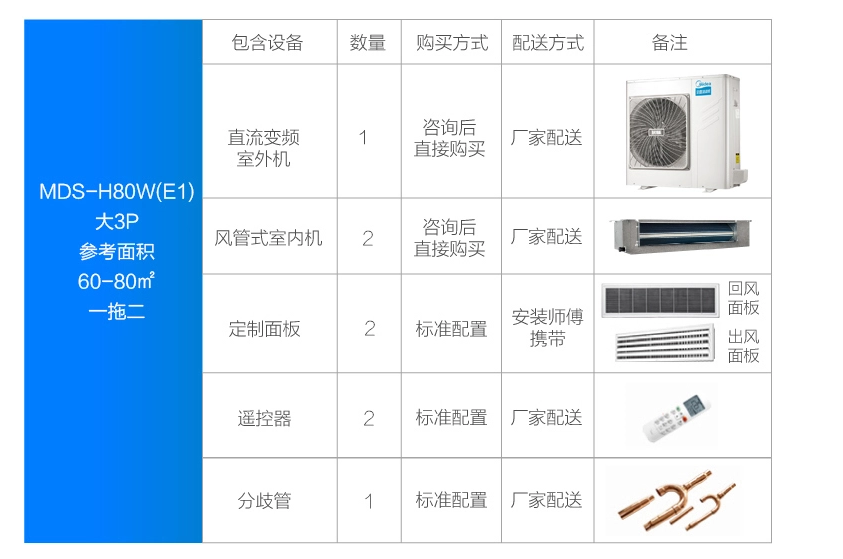 美的 一拖二變頻一級(jí)能效 多聯(lián)風(fēng)管機(jī) 3匹 家用中央空調(diào) MDS-H80W(E1)